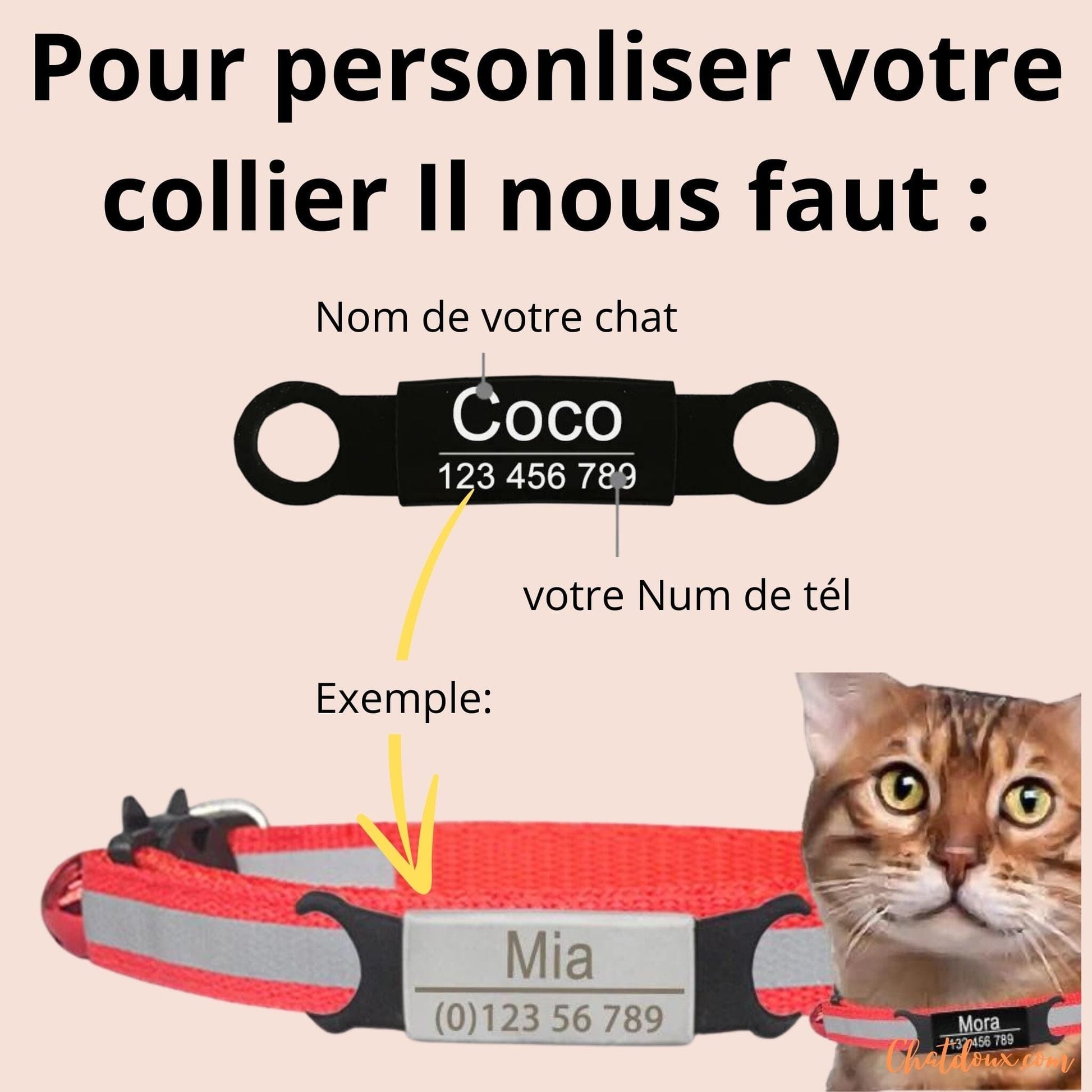 Personnalisez le collier de votre chat avec son nom et vos coordonnées pour une touche unique et pratique.